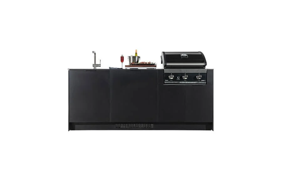 Outdoor kitchen designed in a wall-mounted configuration, constructed with aluminium profiles. The kitchen includes a high-quality 3-burner gas grill, a black countertop and a stainless-steel sink and faucet adapted to outdoor conditions. The kitchen includes a double door storage cabinet under the grill, a dedicated single door vented cabinet for the refrigerator and an additional single door service cabinet under the sink. The kitchen can be ordered in a natural or a black aluminium finish.